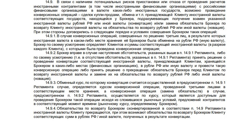 Брокер сможет применить пункт регламента о принудительном обмене валюты, если зарубежные компании приостановят или откажутся проводить расчёты (как это бывает, когда вводят санкции). Условия принудительной конвертации таковы: